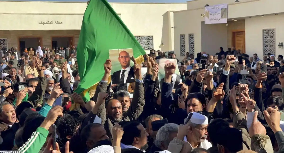 ލީބިޔާގެ ކުރީގެ ލީޑަރު މުއައްމަރުލް ގައްޒާފީގެ ދަރިކަލުން ސައިފުލް އިސްލާމް ގައްޒާފީގެ ޖަނާޒާގައި ބައިވެރި މީހުންގެ ތެރެއިން | ގެޓީ އިމޭޖަސް