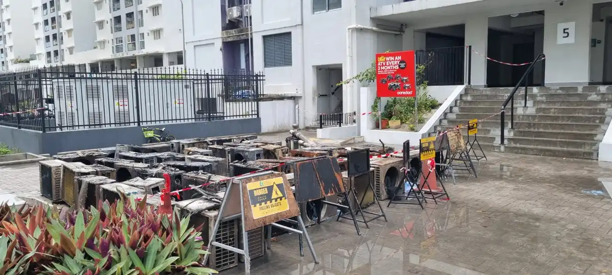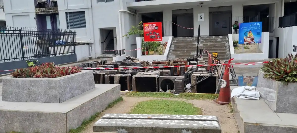 ހިޔާ ފްލެޓް 5 ގައި ހިނގި އަލިފާނުގެ ހާދިސާގައި ގެއްލުންވި އޭސީތަކުގެ އައުޓްޑޯ ޔުނިޓްތައް ބަހައްޓާފައި ހުރީ ޓަވަރަށް ވަންނަ ދޮރުމަތީގައި، މިހާރު އެސަރަހައްދު ވަނީ ސާފުކޮށް އާއްމުންނަށް ހުޅުވާލާފައި | ރާއްޖެއެމްވީ