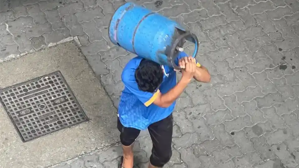 A man carries a gas cylinder to a house along a street in Male'. | Raajje MV