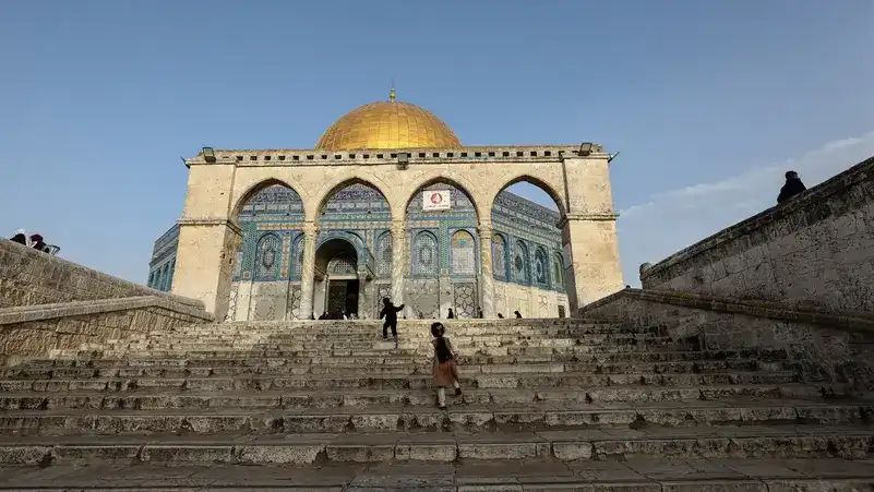 2026 ވަނަ އަހަރުގެ ފެބްރުއަރީ މަހުގެ 17 ވަނަ ދުވަހު، ގުދުސްގެ އޯލްޑް ސިޓީގައި ހުންނަ އަލް-އަގްސާ މިސްކިތުގެ ގޯތިތެރޭގައި، ފަލަސްތީނުގެ ކުޑަކުދިންތަކެއް ޑޯމް އޮފް ދަ ރޮކް (ގުއްބަތުއްޞަޚްރާ) އަށް އަރަން ހުންނަ ސިޑިތަކުން މައްޗަށް އަރަނީ. | ރޮއިޓާސް