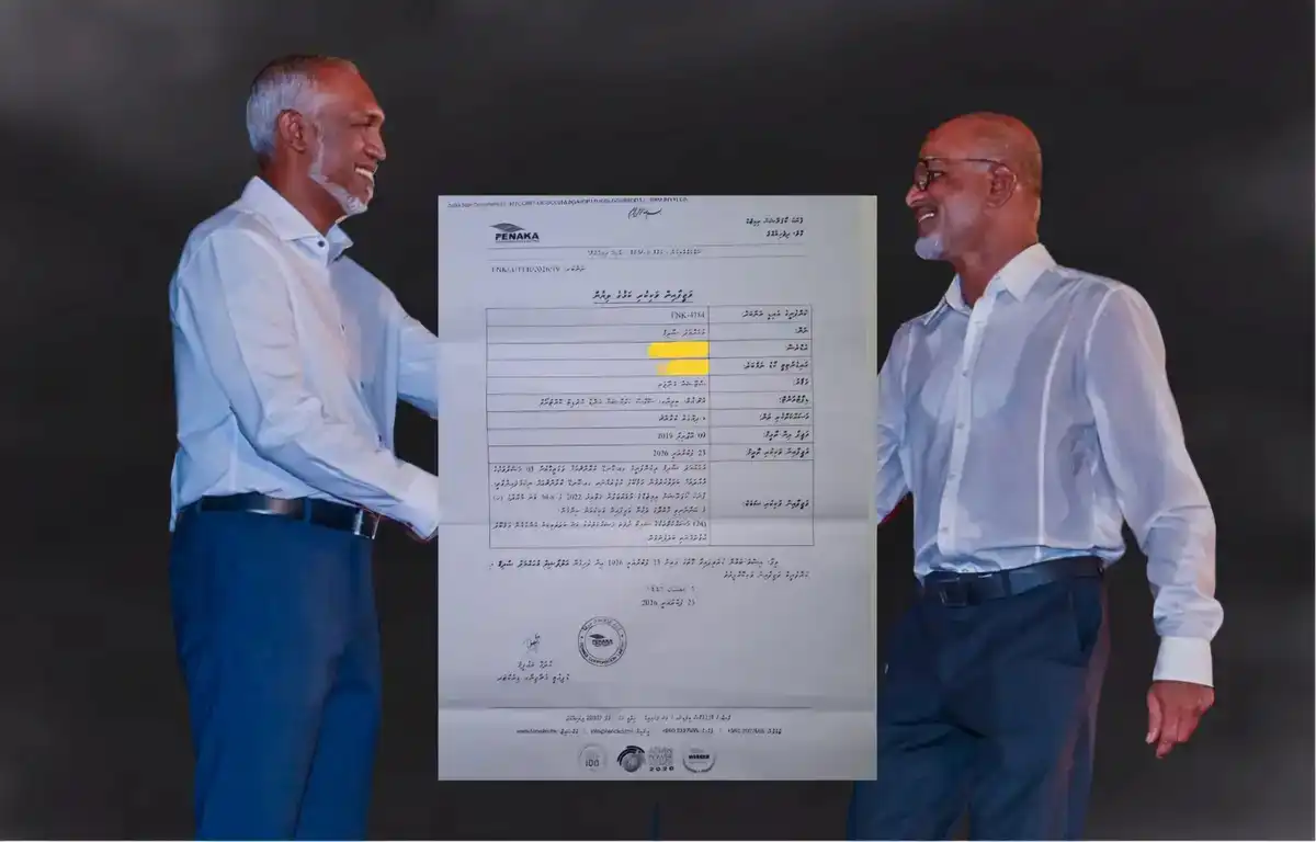 President Muizzu (L), pictured with Nazim (RI): the station manager of the Fenaka branch in Dhiggaru was dismissed from his post due to political influence. | RaajjeMV | Raajjemv graphics