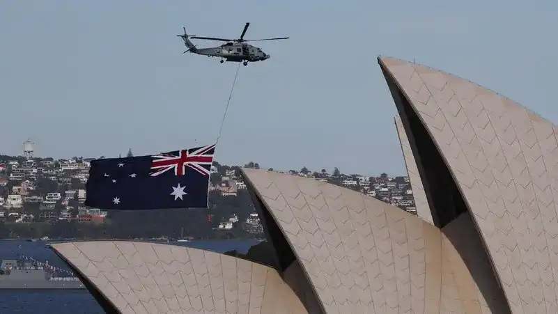 އޮސްޓްރޭލިއާގެ ސިޑްނީއާއި ކެންބަރާއަށް އިނގިރޭސިވިލާތުގެ ރަސްގެފާނު ޗާލްސް ތިންވަނައާއި ރާނީ ކެމިލާ ކުރައްވަމުން ގެންދަވާ ހަ ދުވަހުގެ ރަސްމީ ދަތުރުފުޅުގެ ތެރެއިން، 2024 އޮކްޓޫބަރު 22 ވަނަ ދުވަހު ސިޑްނީގެ އޮޕެރާ ހައުސް ކައިރީގައި ބޭއްވި ކަނޑުގެ ސިފައިންގެ ހަރަކާތްތަކުގެ ތެރެއިން، އޮސްޓްރޭލިއާގެ ދިދަ ހަރުކޮށްފައިވާ ރޯޔަލް އޮސްޓްރޭލިއަން ނޭވީގެ އެމް.އެޗް-60 އާރް ސީހޯކް ހެލިކޮޕްޓަރެއް އެ ސަރަހައްދުން އުދުހެނީ. | އޭއެފްޕީ