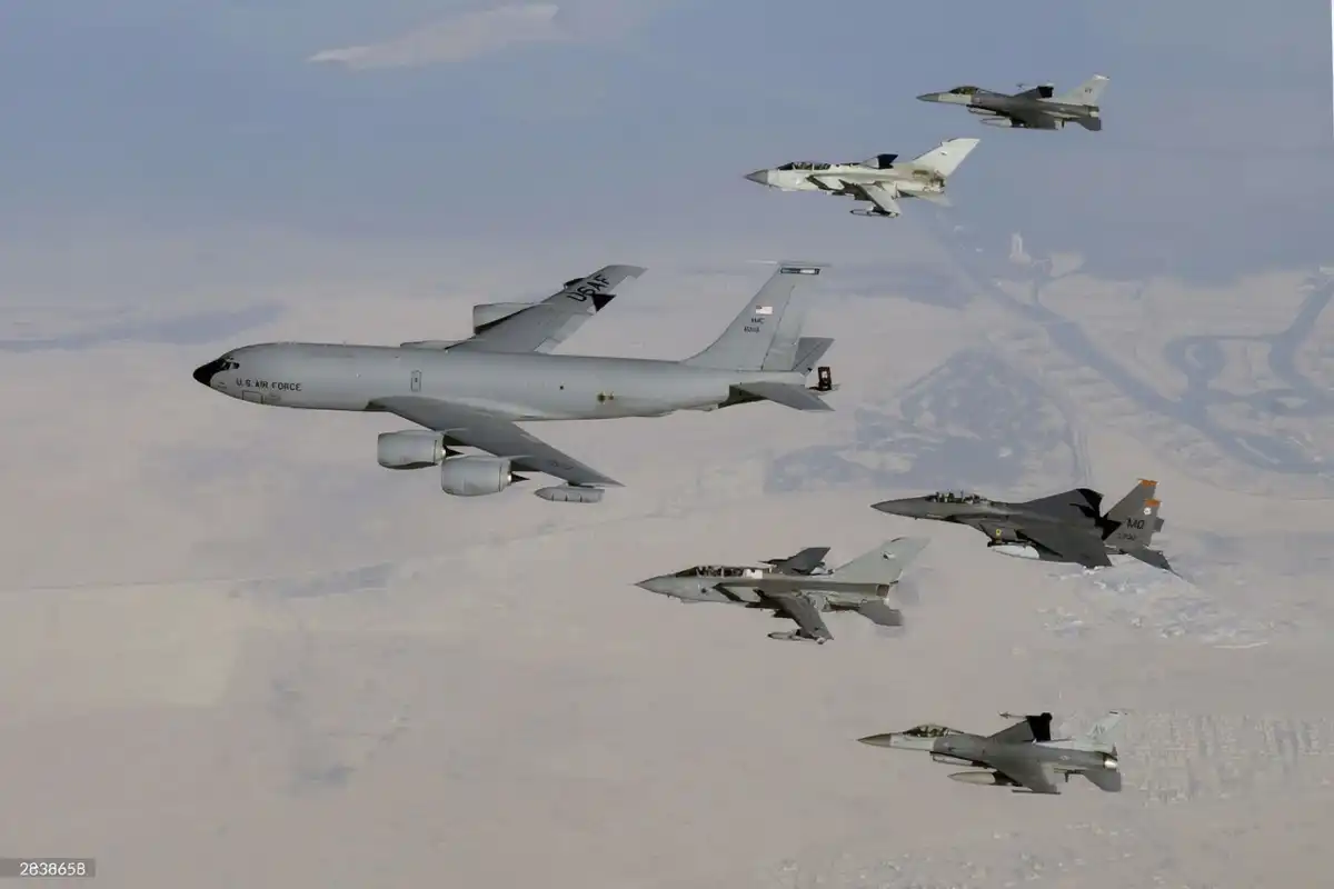 2003 ވަނަ އަހަރުގެ ޑިސެމްބަރު މަހުގެ 29 ވަނަ ދުވަހު، ހާމަކޮށްފައިނުވާ ވައިގެ ސަރަހައްދެއްގައި ކޭސީ-135 ސްޓްރެޓޯޓޭންކަރެއް އިސްވެ އޮވެ، އެފް-15 ސްޓްރައިކް އީގަލް އަކާއި، ދެ އެފް-16 ފައިޓިންގ ފެލްކަންގެ އިތުރުން އިނގިރޭސިވިލާތުގެ ދެ ޖީއާރު4 ޓޯނޭޑޯ ހިމެނޭހެން ޖެޓް ފްލައިޓްތަކެއް ފޯމޭޝަނެއްގައި ދަތުރުކުރަނީ. | ގެޓީ އިމޭޖަސް