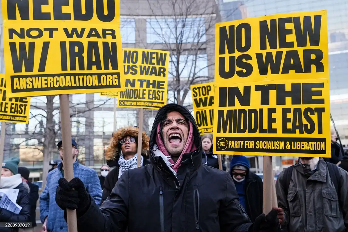 ނިއުޔޯކް ސިޓީގައި 2026 ވަނަ އަހަރުގެ މާރިޗު މަހުގެ 2 ވަނަ ދުވަހު، އެމެރިކާއިން އީރާނާ ދެކޮޅަށް ކުރަމުންދާ ހަނގުރާމަ އާ ދެކޮޅަށް ބޭއްވި މުޒާހަރާއެއްގެ ތެރެއިން، މީހަކު ބޯޑުތަކެއް ހިފައިގެން ހުރެ ޝުއޫރު ފާޅުކުރަނީ. | ގެޓީ އިމޭޖަސް