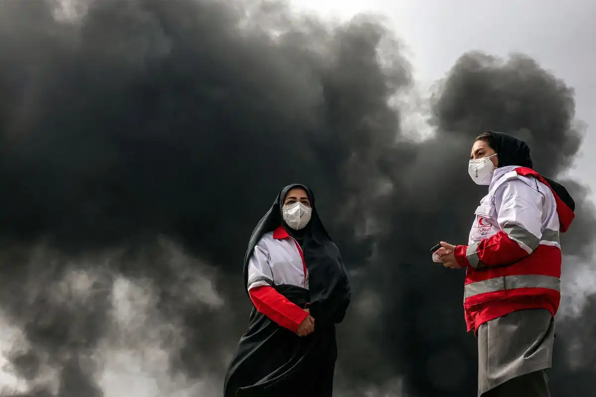 އީރާނުގެ ތެހެރާންގެ ހުޅަނގު އުތުރުގައި ހުންނަ ޝަހްރާން ތެޔޮ ސާފުކުރާ ކާރުޚާނާއަށް 2026 މާރިޗު 8 ވީ އާދީއްތަ ދުވަހުގެ ރޭ ދިން ވައިގެ ހަމަލާތަކާ ގުޅިގެން އުފެދުނު ބޮޑު އަލިފާންގަނޑުން އަރަމުންދިޔަ ދުންގަނޑުތަކުގެ ތެރޭގައި، އީރާނުގެ ރެޑް ކްރެސެންޓް ސޮސައިޓީގެ އަންހެން މެންބަރުންތަކެއް ހަރަކާތްތެރިވަނީ. | ގެޓީ އިމޭޖަސް