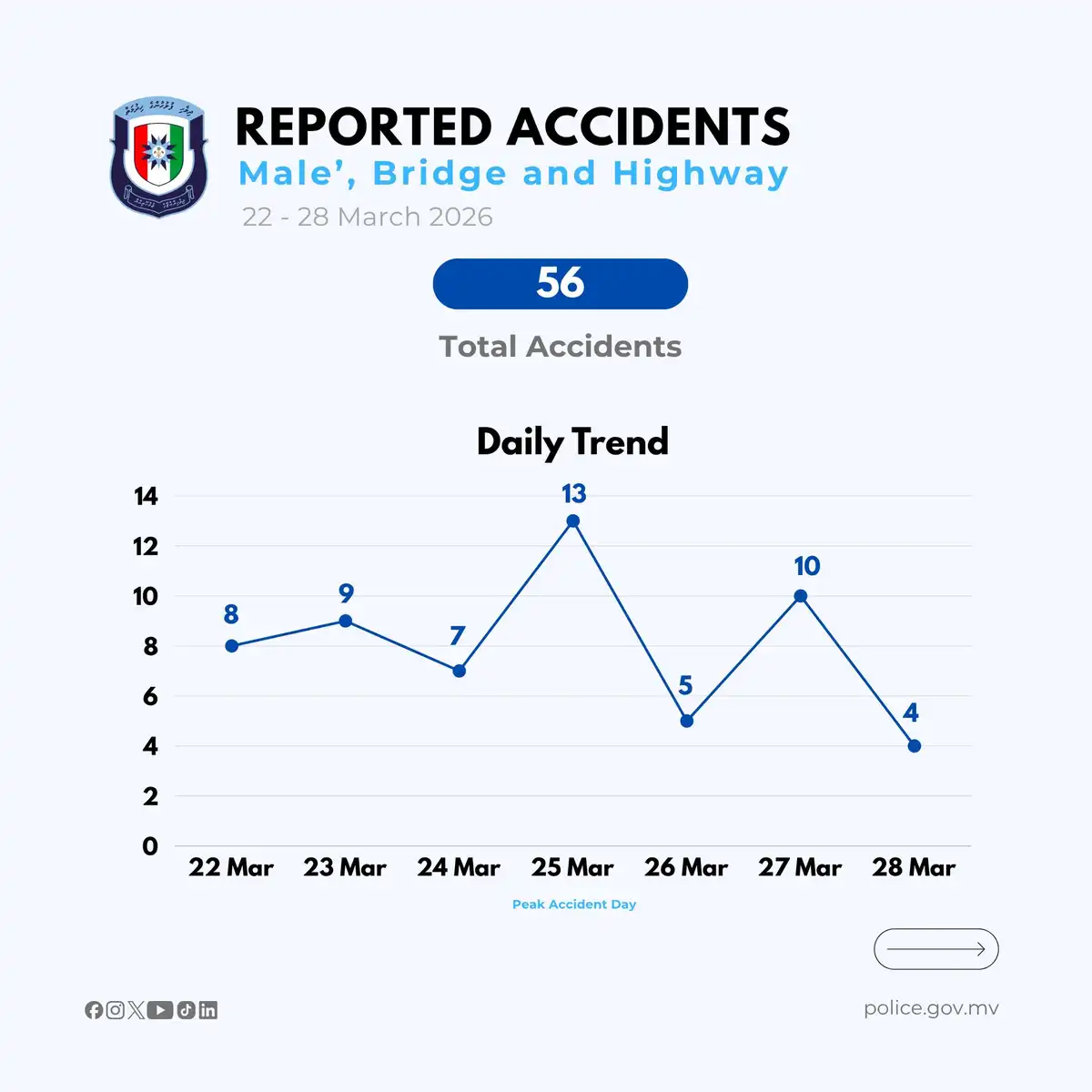 According to police statistics for accidents reported in Male’, the Sinamale’ Bridge, and the highway between March 22 and 28, a total of 49 accidents occurred in Male’ alone. Looking at the daily breakdown for the past week, the highest number of incidents was reported on March 25. On that day alone, 13 accidents were recorded.