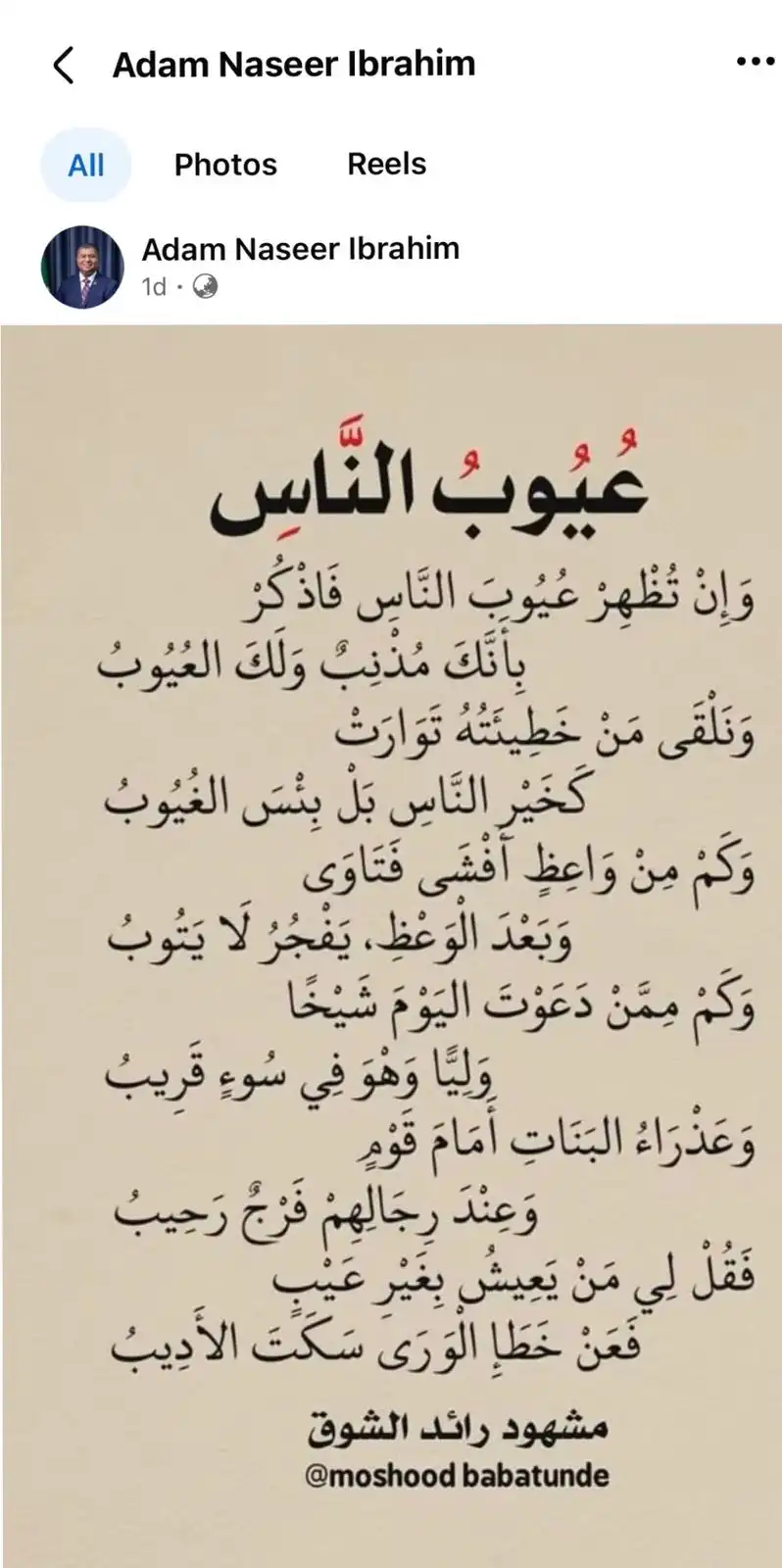 އެހެންމީހުންގެ ގޯސްތައް ދައްކަން އުޅުމުގެ ބަދަލުގައި ފުރަތަމަ އަމިއްލަ ނަފްސު މުތާލިއާކޮށް އިޞްލާޙުކުރުމުގެ މުހިއްމުކަން ދޭހަވާ ޅެމެއް ދާދި ފަހުން ދިވެހި ބަހާއި ސަގާފަތާއި ތަރިކައާ ބެހޭ މިނިސްޓަރުކަމުން އިިސްތިއުފާދެއްވި އާދަމް ނަސީރު އޭނާ ގެ ސޯޝަލް މީޑިއާގައި ހިއްސާ ކުރައްވައިފިއެވެ.