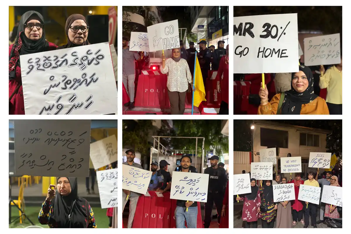 އެކިއެކި ޝުއޫރުތައް ފާޅު ކޮށްފައިވާ ޕްލެކާޑްތައް މުޒާހަރާގެ ބައިވެރިން އުފުލާފައިވާއިރު، އަޑު އަހަރުކޮށް ރައީސް މުއިއްޒުގެ އިސްތިއުފާ އަށް ގޮވަމުން މުޒާހަރާގެ ބައިވެރިން ބުނެފައިވަނީ، ސަރުކާރުން އިސްނަގައިގެން މި މަހުގެ 4 ވަނަ ދުވަހު ބޭއްވި ރިފަރެންޑަމް ވޯޓުގައި ސަރުކާރަށް ލިބިފައިވަނީ އެންމެ 30 އިންސައްތަ ވޯޓު ކަމަށާއި، ސަރުކާރުގެ އިތުބާރު ގެއްލިފައިވާ ކަމަށެވެ.