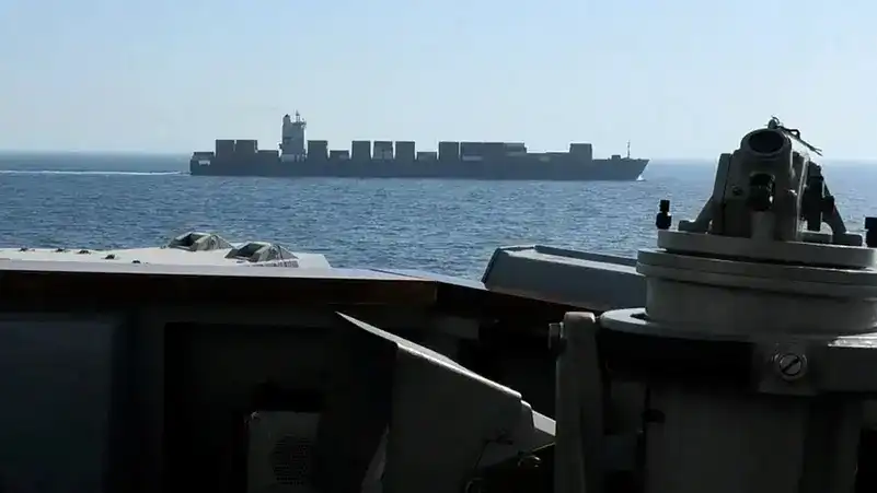 2026 އޭޕްރީލް 19 ވަނަ ދުވަހު އާންމުކޮށްފައިވާ ވީޑިއޯއަކުން ނަގާފައިވާ މި ފޮޓޯއިން ފެންނަނީ، އަރަބި ކަނޑުގެ އުތުރު ސަރަހައްދެއްގައި އެމެރިކާގެ ކަނޑުގެ ސިފައިންގެ "އާލީ ބާކް-ކްލާސް އީޖިސް ގައިޑެޑް މިސައިލް ޑިސްޓްރޯޔާ" އެމް.އެސް.އެސް ސްޕްރޫއަންސް އިން، އީރާނުގެ ދިދަ ޖަހާފައިވާ "އެމް/ވީ ޓޫސްކާ" ނަމަކަށް ކިޔާ މުދާ އުފުލާ ބޯޓެއް ހުއްޓުވައި ބަލައިފާސްކުރާ މަންޒަރު. | ރޮއިޓާސް