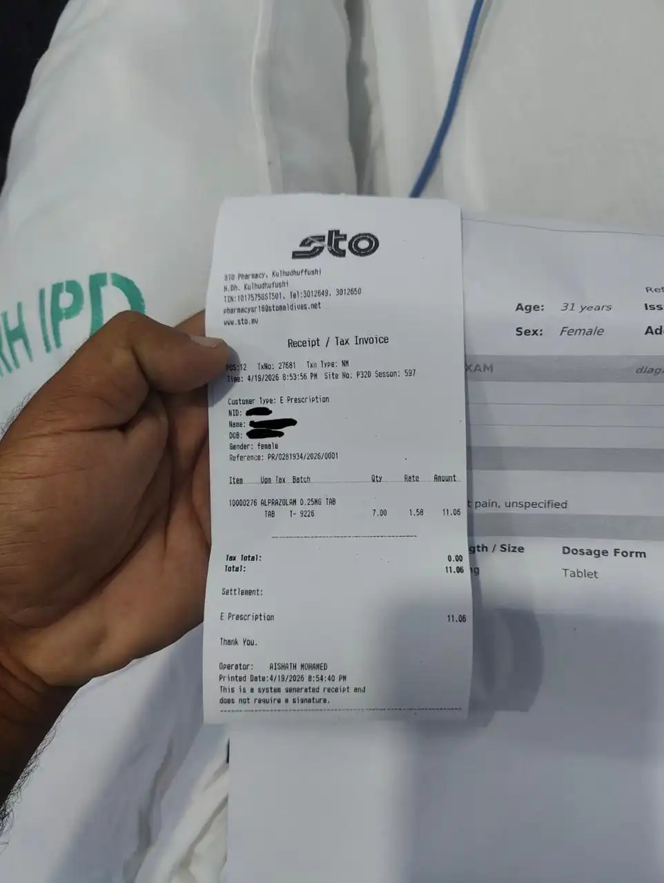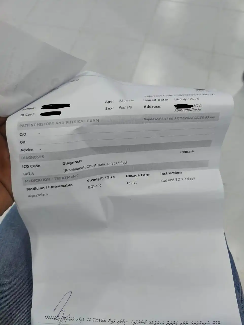 އާއިލާގެ ފަރާތުން ބުނީ، 19 އޭޕްރީލް 2026 ވަނަ ދުވަހު ޕޭޝަންޓު ވަރަށް ބޮޑަށް މޭގައި ރިއްސައި، ނޭވާލުމަށް އުދަނގޫވާތީ ކުޅުދުއްފުށި ރީޖަނަލް ހޮސްޕިޓަލަށް ޑޮކްޓަރަށް ދެއްކި ކަމަށާއި، އީއާރްގައި އެޑްމިޓް ކުރި ކަމަށެވެ. އަދި ޑޮކްޓަރަށް ދެއްކުމުން ދީފައިވަނީ ޕްރޯލަމް 0.25 މިލިގްރާމް ބޭހެވެ.