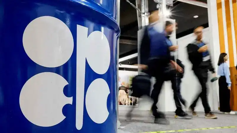 ޕެޓްރޯލިއަމް އެކްސްޕޯޓްކުރާ ގައުމުތަކުގެ ޖަމިއްޔާ، އޯޕެކްގެ ލޯގޯ ޖަހާފައިވާ ތެޔޮ ފީފާއެއްގެ މޮޑެލްއެއް ބަހައްޓާފައި ހުރި ސަރަހައްދަކުން ބަޔަކު ހިނގާފައި ދަނީ. | ރޮއިޓާސް
