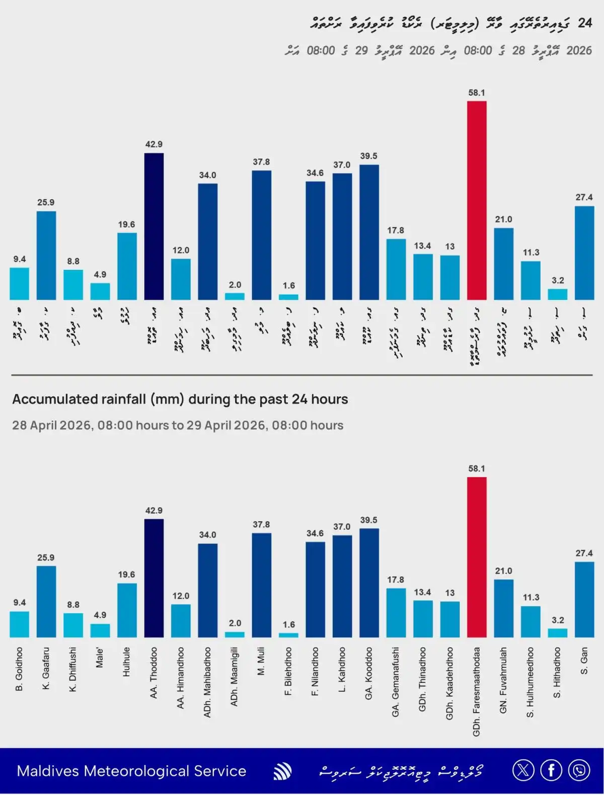 މީގެ އިތުރުން އެ އިދާރާއިން ބުނީ، އަންގާރަ ދުވަހުގެ ހެނދުނު 8:00ން ބުދަ ދުވަހުގެ ހެނދުނު 8:00ށް އެންމެ ގިނައިން ވާރޭ ވެހިފައިވަނީ ގދ. ފަރެސްމާތޮޑާ ކަމަށާއި، އެރަށަށް 58.1 މިލިމީޓަރުގެ ވާރޭ ވެހިފައިވާ ކަމަށެވެ. ދެ ވަނަ އަށް 42.9 މިލިމީޓަރުގެ ވާރޭ އއ.ތޮއްޑޫ އަށް ވެހިފައިވާއިރު، ތިން ވަނަ އަށް ގއ. ކޫއްޑޫއަށް 39.5 މިލިމީޓަރުގެ ވާރޭ ވެހިފައިވާ ކަމަށެވެ. އަދި މ.މުއްޔަށް 37.8 މިލިމީޓަރުގެ ވާރޭ، ލ.ކައްދޫއަށް 37.0 މިލިމީޓަރުގެ ވާރޭ، ފ.ނިލަންދޫއަށް 34.6 މިލިމީޓަރުގެ ވާރޭ އަދި އދ.މަހިބަދޫ އަށް 34.0 މިލިމީޓަރުގެ ވާރޭ ވެހިފައިވާ ކަމަށް މޫސުމާބެހޭ ގައުމީ އިދާރާގެ އާއްމުކޮށްފައިވާ ތަފާސްހިސާބުތަކުން ދައްކަ އެވެ.