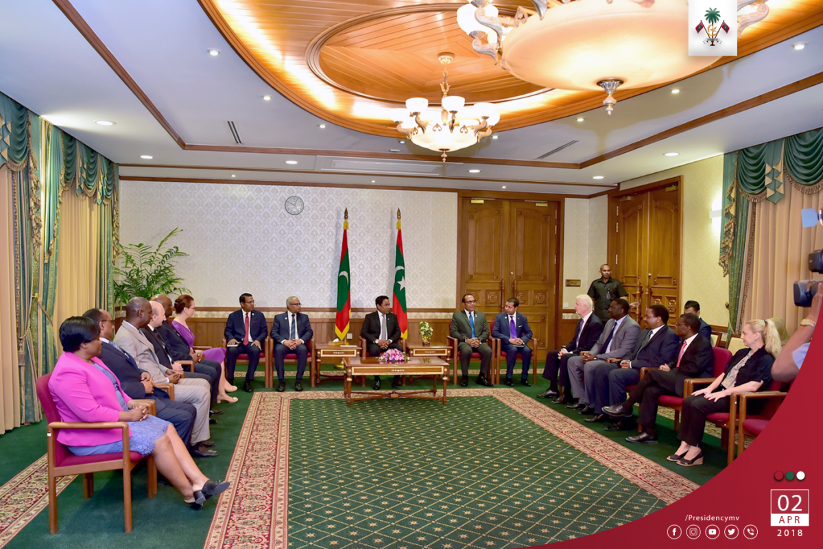 އދ. އަށް ކަނޑައަޅުއްވާފައި ތިއްބަވާ ޕާމަނަންޓް ރެޕްރެޒެންޓޭޓިވުން ހިމެނިވަޑައިގަންނަވާ ވަފްދަކާއެކު ރައީސް ޔާމިން ބޭއްވެވި ބައްދަލުވުން: ފޮޓޯ- ރައީސް އޮފީސް