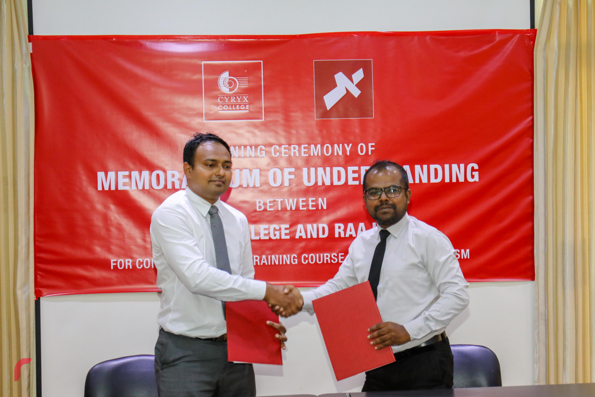 The agreement was signed by RaajjeTV COO Hussain Fiyaz Moosa and Cyryx College’s Dean of Students Anil Adam on Tuesday.