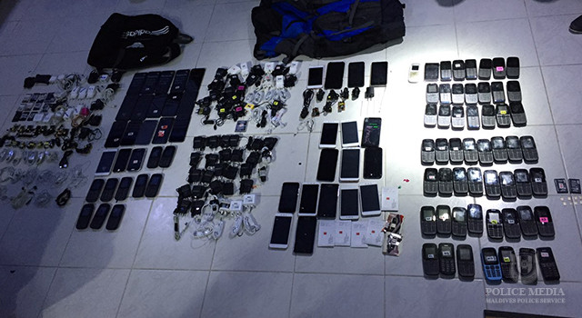 މި ހަތަރު މީހުން ފުލުހުންގެ ބެލުމުގެދަށް ގެންގޮސް ބަލައިފާސްކުރި ކުރުމުން، އެމީހުން ގެންގުޅުނު ދަބަހެއްގެ ތެރެއިން 98 މޮބައިލް ފޯނާއި، 104 ޗާޖަރާއި، 18 ސިމް ކާރޑާއި، 9 ހެޑް ސެޓާއި، 30 ޔޫއެސްބީ ކޭބަލާއި، ފޯނު ބެޓެރީގެ 14 ބެޓެރިއާއި، ޖޮއިސްޓިކެއް ފެނިފައިވާ ކަމަށް ފުލުހުންގެ އިދާރާއިން މައުލޫމާތުދެއެވެ.