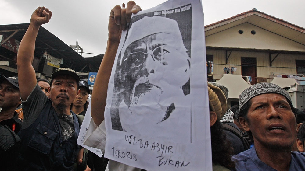 ޖަމާހް އިސްލާމިއްޔާގެ ރޫހާނީ ލީޑަރު އަބޫ ބަކަރު ބާޝިރް މިނިވަންކުރަން ގޮވާލާ މުޒާހަރާ ކުރަނީ