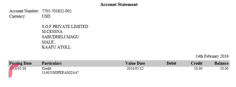 އެސްއޯއެފްގެ ބޭންކް ސްޓޭޓްމެންޓެއްގެ ފޮޓޯއެއް