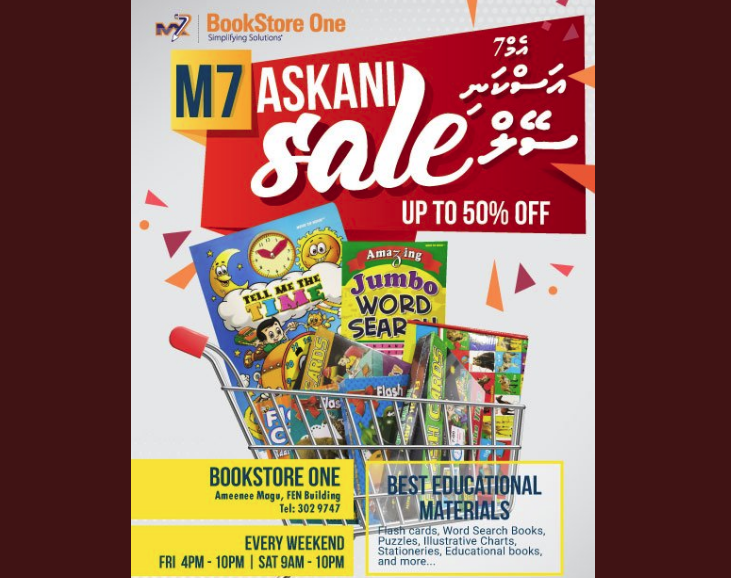 އަމީނީމަގު ފެން ބިލްޑިން ކައިރީގައި ކޮންމެ ހަފްތާބަންދެއްގައި ކުރިއަށްގެންދާ މިސޭލްގައި 30 އިންސައްތައިން ފެށިގެން 70 އިންސައްތައާއި ހަމައަށް ޑިސްކައުންޓް ލިބޭނެއެވެ. މި ސޭލްގައި ކުޑަކުދިންނަށް ބޭނުންވާ ތަފާތު ގިނަ ފޮތްތަކާއި ކިޔެވުމަށް ބޭނުންވާ ސާމާނު ލިބެން ހުންނާނެއެވެ.