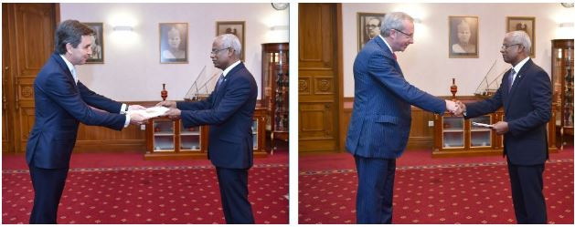 ޕޯޗުގަލްގެ ސަރުކާރުން ރާއްޖެއަށް ކަނޑައެޅުއްވި އާ ސަފީރު ކަރލޮސް ޖޯސް ޑެ ޕިންހޯ ޕެރޭރާއާއި ބެލްޖިއަމްގެ ސަރުކާރުން ރާއްޖެއަށް ކަނޑައެޅުއްވި އާ ސަފީރު ފްރެންސުއާ ޑެލްހާޔޭގެ ސަފީރުކަމުގެ ފަތްކޮޅު، ރައީސުލްޖުމްހޫރިއްޔާ އިބްރާހީމް މުހައްމަދު ސޯލިހަށް މިއަދު އަރުވައިފިއެވެ.