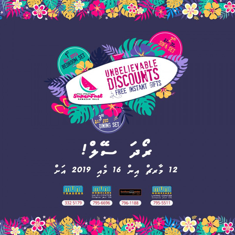ނޯތު ހާރބަރ ކުރިމަތިން ބޮޑުތަކުރުފާނު މަގުގައި ހުންނަ މުނި ޓްރޭޑަރސް އާއި ހުޅުމާލޭ ސެންޓްރޯ މޯލްގެ 3 ވަނަ ފްލޯގައި ހުންނަ މުނިހޯމްކެއަރ ސޭލްސް ސެންޓަރގައި ވެސް މި ސޭލްގައި ބޮޑު ޑިސްކައުންޓްތަކާ އެކު ހިލޭ އެތައް ހަދިޔާއެއް ވަގުތުން ލިބޭނެ ކަމަށް އެ ކުންފުނިން ވަނީ ހާމަކޮށްފައެވެ. މީގެ އިތުރުން ވެސް ސުޕަރ ފާސްޓް ރޯދަސޭލްގައި ކޮންމެ ހަފްތާއަކު މުޅިން ހިލޭ އަގުހުރި އިނާމްތަކެއް ލިބިގެންދާއިރު ގްރޭންޑް ޕްރައިޒްގެ ގޮތުގައި 1 ވަނަ އަށް ހޮވޭ ފަރާތަކަށް ބެޑްރޫމް ސެޓެއް، 2 ވަނަ ފަރާތަކަށް ސޯފާ ސެޓެއް އަދި 3 ވަނަ ފަރާތަކަށް ޑައިނިންގ ސެޓެއް ދެވޭނެއެވެ.