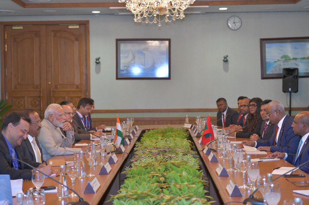 ރައީސް އޮފީހުގައި ހޮނިހިރު ދުވަހު ބޭއްވި އެއްބަސްވުންތައް ބަދަލުކުރެއްވުމުގެ ރަސްމިއްޔާތުގައި ރައީސުލްޖުމްހޫރިއްޔާ އިބްރާހީމް މުހައްމަދު ސޯލިހުއާ އިންޑިއާގެ ބޮޑުވަޒީރު ނަރެންދުރަ މޯދީ ބައިވެރިވެ ވަޑައިގެންނެވިއެވެ.