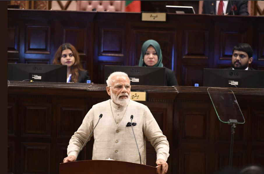 ހޮނިހިރު ދުވަހު ރާއްޖެ ވަޑައިގެން ރައްޔިތުންގެ މަޖިލީހުގައި ދެއްވި ތަގްރީރްގައި ވާހަކަފުޅު ދައްކަވަމުން ބޮޑުވަޒީރު މޯދީ ވިދާޅުވީ އިންތިޚާބު ކާމިޔާބުކުރެއްވުމަށް ފަހު ގައުމުން ބޭރަށް ކުރައްވާ ފުރަތަމަ ދަތުރުފުޅުގައި ރާއްޖެ ޚިޔާރުކުރެއްވީ "ނެއިބަރހުޑް ފަސްޓް" ޕޮލިސީގެ ދަށުން ކަމަށެވެ. އިންޑިޔާ އަބަދުވެސް އެ ގައުމު އަވައްޓެރިންނަށް ކަމޭހިތާނެ ކަމަށާއި، އެ މީހުންގެ ހާލު ބަލަމުންދާނެ ކަމަށް ވިދާޅުވިއެވެ.