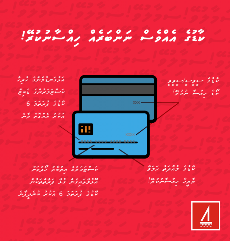 ބޭންކް އޮފް މޯލްޑިވްސް އާއި އެހެނިހެން ކުންފުނި އަދި އިދާރާތަކުގެ ނަމުގައި އެކި ފަރާތްތަކަށް ގުޅައި އެކައުންޓަކަށް ފައިސާ ޖަމާކުރުމަށް އެދި، ކާޑުގެ މަޢުލޫމާތާއި ސެކިޔުރިޓީ ކޯޑު އަދި ޕިން ހޯދަން މަސައްކަތްކުރަމުންދާކަން ވަނީ ފާހަގަކުރެވިފައި ކަމަށާއި ކަސްޓަމަރުންގެ ކާޑުގެ މައުލޫމާތު ހޯދަން ބޭންކުން ނުގުޅާނެ ވާހަކަ ތަކުރާރުކޮށް ދަންނަވާ ކަމަށް އެކުންފުނިން ބުނެފި އެވެ.