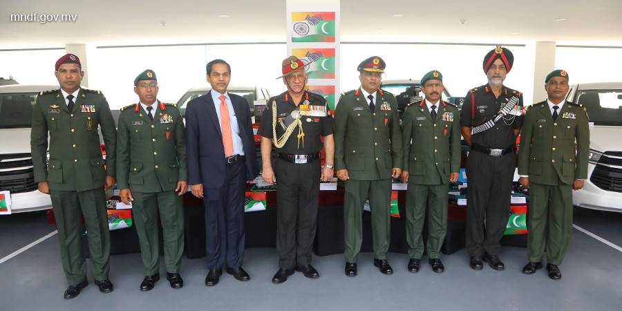 General Rawat presented the vehicles -three cars, a pickup and spares- to Chief of Defence Force, Abdulla Shamaal, at an event held at Bandaarakoshi on Tuesday.
