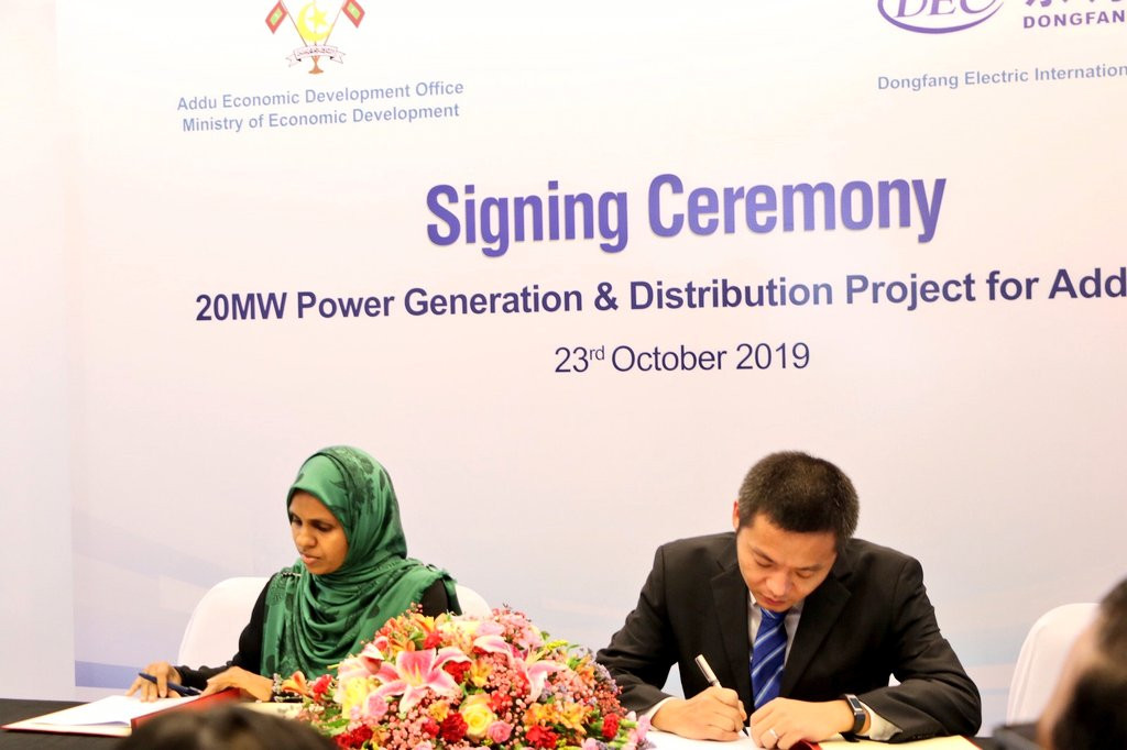 ހިތަދޫގައި 20 މެގަވޯޓުގެ ކަރަންޓުގެ މަޝްރޫއު ކުރިއަށްގެންދިއުމަށް ހަވާލުކުރީ ޗައިނާގެ ޑޮންގްފަނގ އިލެކްޓްރިކް އިންޓަނޭޝަނަލް ކޯޕަރޭޝަނާ އެވެ.