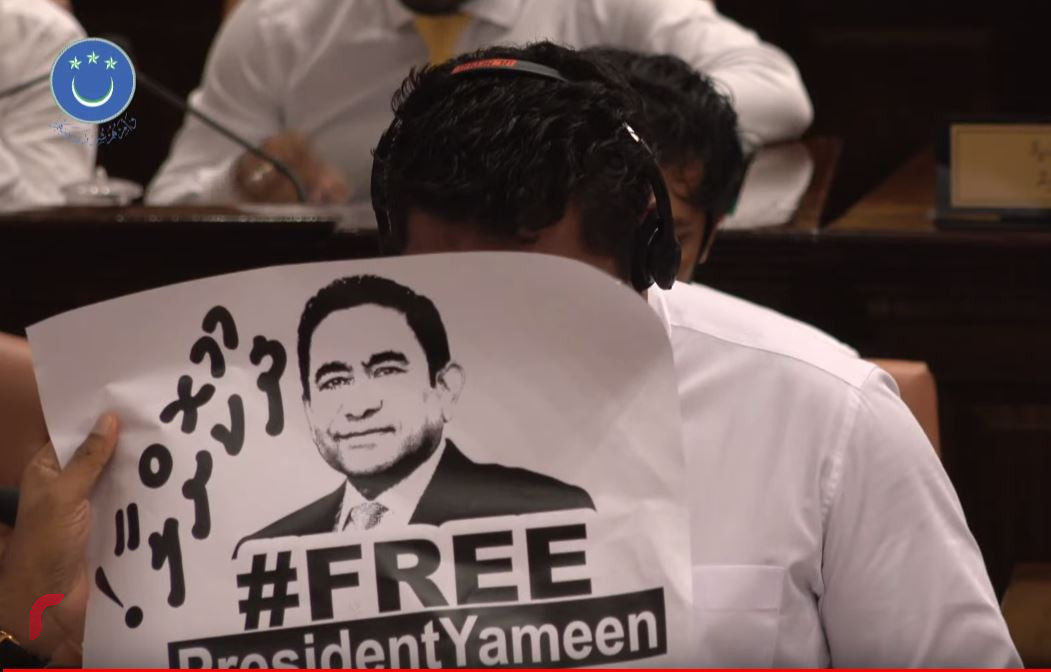 Lawmakers representing the Progressive Party of Maldives (PPM) and People's National Congress (PNC) disrupted the sitting after recess at around 11:00 am, calling for the immediate release of former President Yameen. They also called for the release of "political prisoners".
