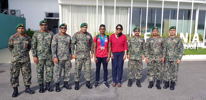އެމްއެންޑީއެފްގެ ސަރޖެންޓް ހަސަން ސާއިދު އަންގާރަ ދުވަހު ހެނދުނު ރާއްޖެ އައުމުން ވެލާނާ އިންޓަނޭޝަނަލް އެއަރޕޯޓުން މަރުހަބާ ދެންނެވީ ޑިފެންސް މިނިސްޓަރ މާރިޔާ އަހުމަދު ދީދީ އާއި ޗީފް އޮފް ޑިފެންސް ފޯސް މޭޖަރ ޖެނެރަލް އަބްދުﷲ ޝަމާލް އެވެ.