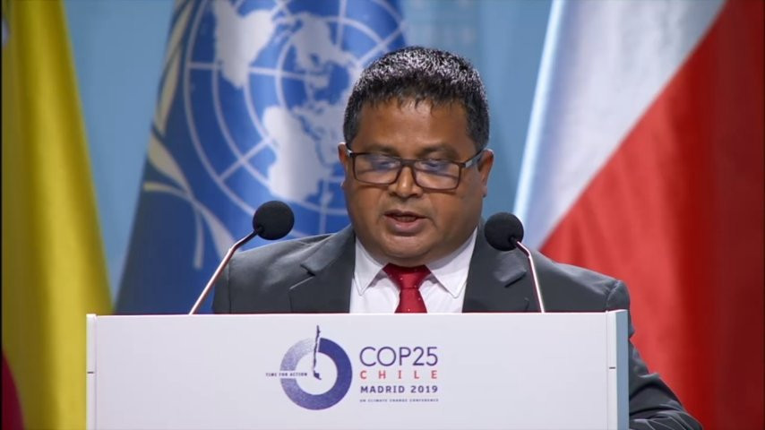 ޔުނައިޓެޑް ނޭޝަންސް ފްރޭމްވަރކް ކޮންވެންޝަން އޮން ކްލައިމެޓް ޗޭންޖު، ކޮޕް 25ގައި ތަގުރީރު ކުރައްވަމުން ރާއްޖޭގެ ތިވެމާށީގެ ނާޒުކުކަން ފާހަގަކުރައްވާ މިނިސްޓަރ ވިދާޅުވީ ދުނިޔެ ހޫނުވުމާއި ގުޅިގެން ހަދާފައިވާ އެކި ސައިންޓިފިކް ދިރާސާތަކުގައި ހުރި އެކި މައުލޫމާތު ސައްޚަ ނަމަ އަދި ދުނިޔޭގެ ބާރުތަކުން އެކަމާއި މެދު އަވަސް ފިޔަވަޅު ނާޅައިފިނަމަ 10 އަހަރު ތެރޭގައި ފަރުތައް ނެތިގެން ހިނގައިދާނެ ކަމަށެވެ. އަދި މީގެ ނަތީޖާއަކަށް ވެގެންދާނީ ރަށްތައް ގިރުމާއި އުދައެރުން ފަދަ ނޭދެވޭ އަސަރުތައް ފަތުރުވެރި ކަމަށާއި މަސްވެރިކަމަށް ކުރާނެ ކަމަށެވެ.