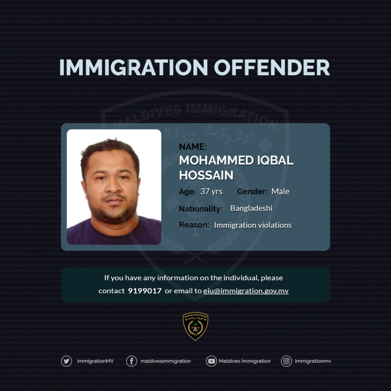 According to the announcement by Maldives Immigration made via Twitter, the authority is searching for 37-year-old, Mohammed Iqbal Hossain for violations of Immigration law. As such, no further information has been disclosed regarding the nature of the offense.