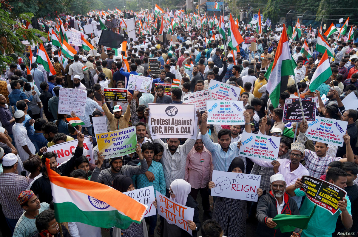 ހައިދްރާއާބާދުގެ މުޒާހަރާގެ ބައިވެރިން ހިފައިގެން ތިބި ބެނަރ ތަކުގައި ލިޔެފައިވަނީ '' ސީއޭއޭ ބިލް ވަގުތުން ނަގާ'' އާއި ''އިންޑިއާގެ ދީނަކީ ހަމައެކަނި ސެކިއުލަރިޒަމް'' މިހެންނެވެ.