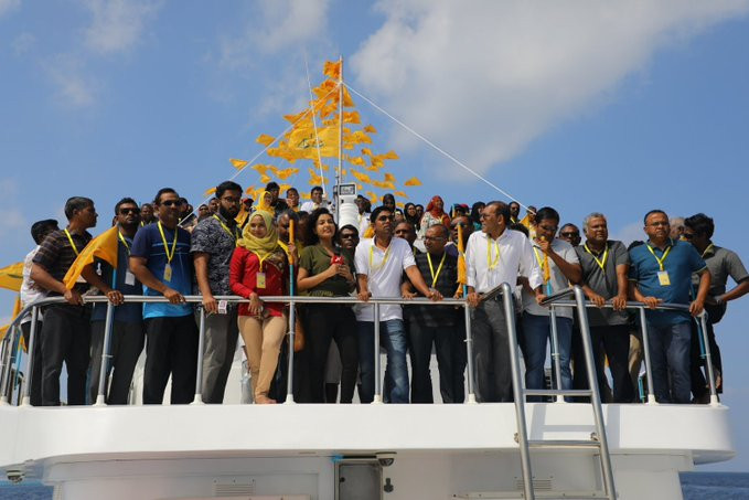ޕާޓީގެ ކެމްޕޭން ލަވައިގެ ފޯރިއާއިއެކު އެންމެން އެކުގައި ބޯޓުތެރޭގައި ސައިބޮމުން ދިޔަ ވަގުތު ރައީސް ނަޝީދުވެސް ވަނީ އެންމެނާއެކު ސައިފޮދު ހިއްޕެވުމުގައި ބައިވެރިވަޑައިގެންފައެވެ. އެންމެން ސައި ބޮމުން ދިޔަ ވަގުތު ޕާޓީގެ ރައީސް ބޯޓުތެރޭގައި ހިންގަވާ ޕާޓީގެ މެންބަރުނާއި ވާހަކަދައްކަވާ އުޅުއްވާ މަންޒަރު ފެނިގެން ދިޔައެވެ.