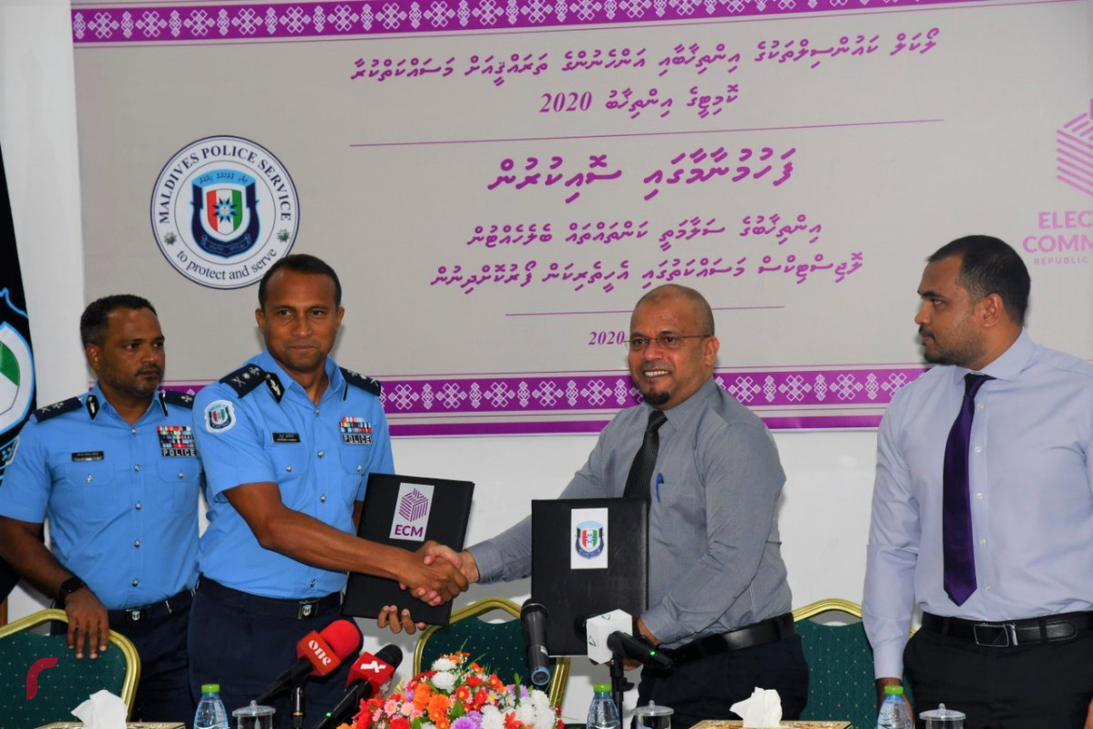ލޯކަލް ކައުންސިލް އިންތިޚާބު 2020 އަދި އަންހެނުންގެ ތަރައްޤީއަށް މަސައްކަތްކުރާ ކޮމިޓީގެ އިންތިޚާބު 2020 ގެ ސަލާމަތީ ކަންކަން ބެލެހެއްޓުމަށާއި ލޮޖިސްޓިކް މަސައްކަތްތަކުގައި އެހީތެރިކަން ފޯރުކޮށްދިނުމަށް އިލެކްޝަންސް ކޮމިޝަނާއި، މޯލްޑިވްސް ޕޮލިސް ސަރވިސްއާ ދެމެދު އެއްބަސްވުމެއްގައި ސޮއިކޮށްފިއެވެ.