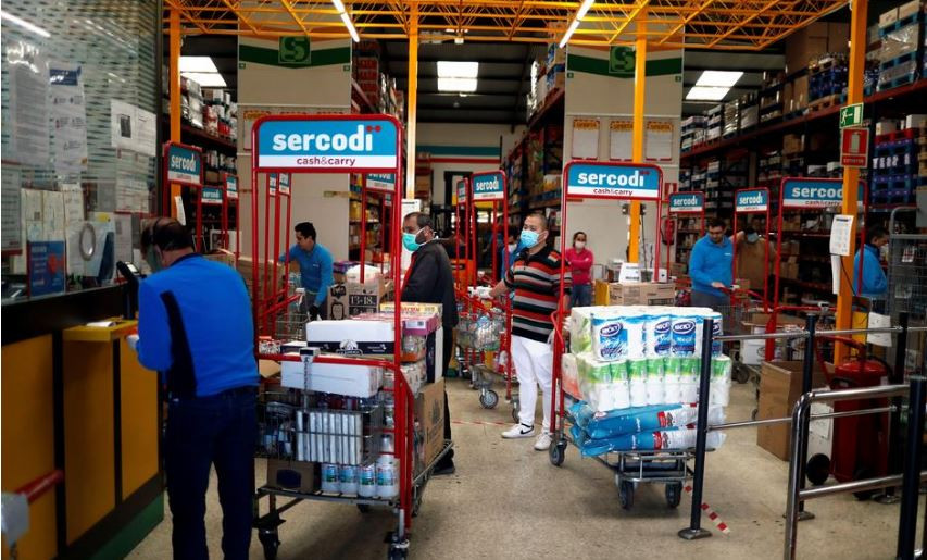 ސްޕެއިންގެ ދެކުނުގެ ސަރަހައްދެއް ކަމުގައިވާ ރޮންޑާ ގައި އޭޕްރީލް މަހުގެ 13 ވަނަ ދުވަހު މާސްކް އަޅައިގެން ތިބި ބަޔަކު ފިހާރައަކުން ތަކެތި ގަންނަނީ