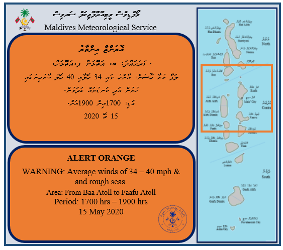 އޮރެންޖް އެލަރޓް ނެރެފައިވަނީ މިރޭ 7 ޖެހުމާ ހަމައަށެވެ. މެޓް އޮފީހުން ބުނީ ރާއްޖޭގެ ބޮޑުބަޔަކަށް ވިއްސާރަކޮށް ބައެއް ރަށްތަކަށް ގުގުރުމާއެކު ބޯކޮށް ވާރޭވެހެނޭ ކަމަށް ލަފާކުރެވޭ ކަމަށެވެ.
