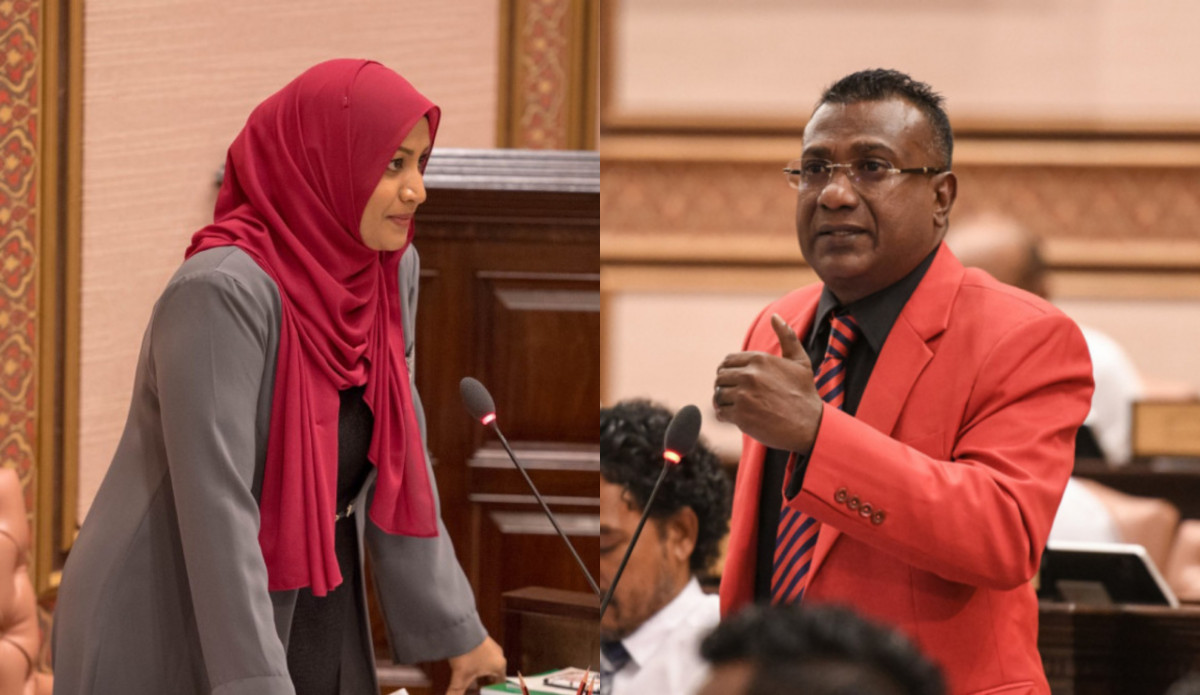 ކާށިދޫ ދާއިރާގެ މެމްބަރު އަބްދުﷲ ޖާބިރު، އަދި ޓްރާންސްޕޯޓު މިނިސްޓަރ އައިޝަތު ނަހުލާ، މަޖިލީހުގެ ޖަލްސާއެއްގައި