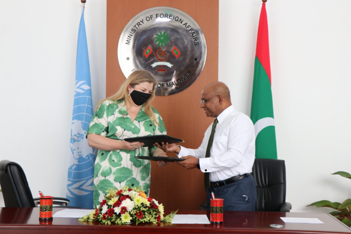 During a ceremony held at the Ministry of Foreign Affairs, the two projects were signed by Minister of Foreign Affairs, Abdulla Shahid and the UN Resident Coordinator, Catherine Haswell.
