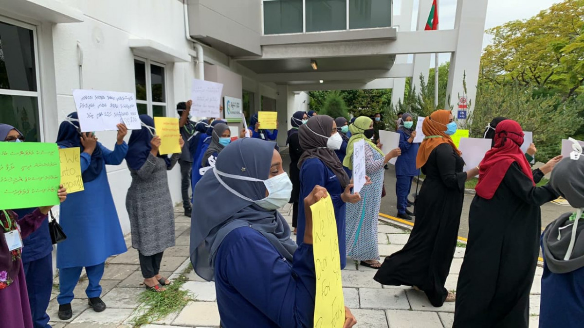 ކޮވިޑް-19ގެ ކުރީ ސަފުގައި މަސައްކަތް ކުރާ ފަރާތްތަކަށް ސަރުކާރުން ދެމުންދާ ފްރޮންޓް ލައިން އެލަވެންސް ނުލިބޭތީ ކަމަށް ހުޅުމާލޭ ހޮސްޕިޓަލުގައި މަސައްކަތް ކުރާ ނަރުހުންގެ އިތުރުން އެތަނުގައި މަސައްކަތް ކުރާ މުވައްޒަފުންތަކެއް އިހްތިޖާޖު ކޮށްފިއެވެ.