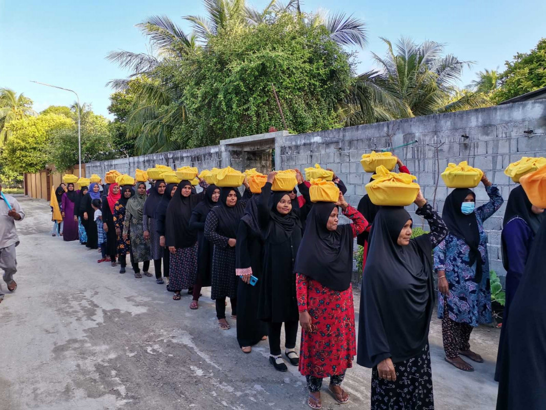 ލިބިފައިވާ ފޮޓޯ ވީޑިއޯތަކުން ފެންނަ ގޮތުން އެރަށުގެ ރައްޔިތުން ފަރިވަޅު ތައްޔާރު ކުރުމަށްފަހު ރަށުގެ އަންހެންވެރިން ވަނީ ފަރިވަޅު ހިފައިގެން މަސައްކަތްތެރިންނަށް ދިނުމަށް ބޮޑު ސަފެއް ހަދާލާފައެވެ.