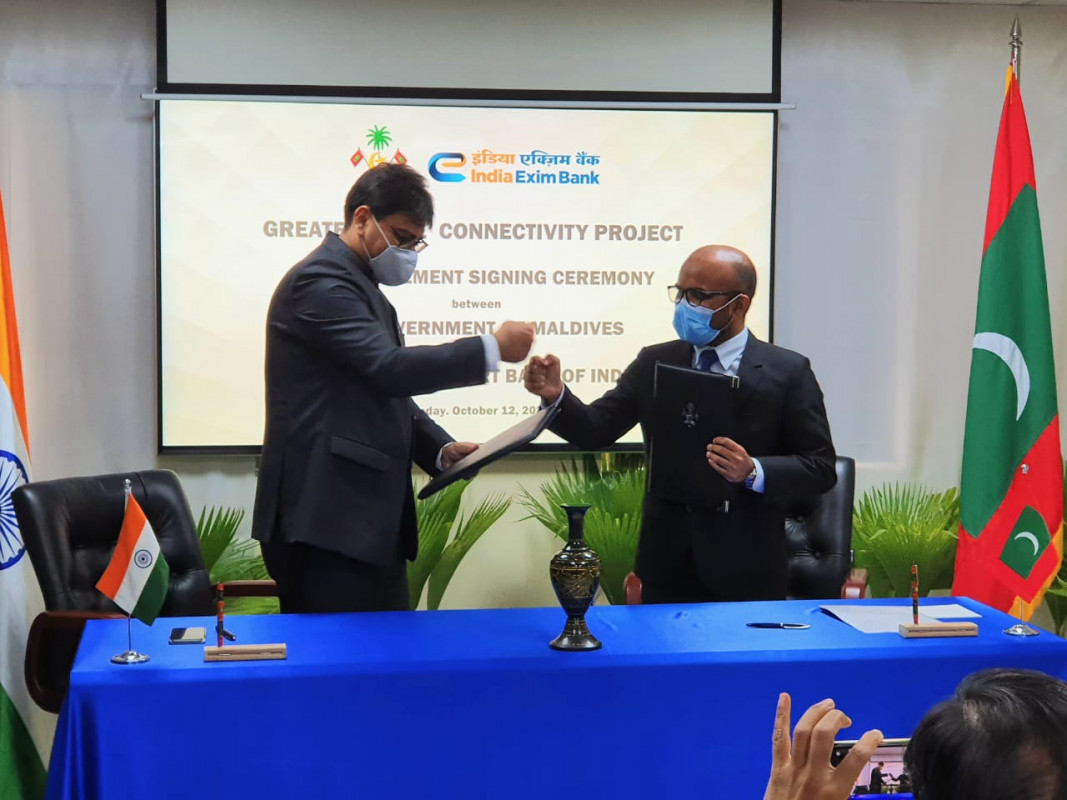 މާލެ އާއި ވިލިމާލެ އާއި ގުޅިފަޅު އަދި ތިލަފުށި ގުޅުވައިދޭ ބްރިޖު މަޝްރޫއު ނުވަތަ "ގްރޭޓަރ މާލެ ކަނެކްޓިވިޓީ-މާލެ ޓު ތިލަފުށި ލިންކް ޕްރޮޖެކްޓް" ގެ މަޝްރޫއުއަށް އިންޑިއާގެ އެކްސްޕޯޓް އިމްޕޯޓް ބޭންކް އޮފް އިންޑިއާ (އެގްޒިމް އިންޑިއާ) މެދުވެރިކޮށް ދޭން ނިންމާފައިވާ 400,000,000 އެމެރިކާ ޑޮލަރުގެ ލޯނުގެ އެއްބަސްވުމުގައި ސޮއިކޮށްފިއެވެ.