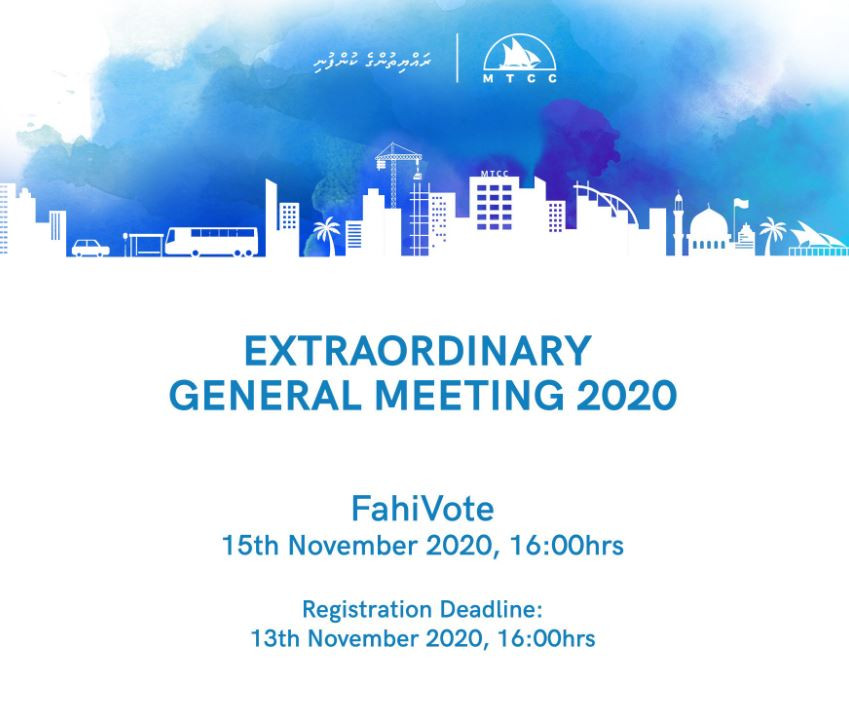 ކުންފުނީގެ މިއަހަރުގެ ޚާއްސަގޮތުން ކުރާ ޢާންމު ޖަލްސާ ބާއްވަނީ އޮންލައިން ވަޞީލަތެއް މެދުވެރިކޮށް ކަމަށާއި އެހެންކަމުން ބައިވެރިވާން ބޭނުންވާ އެންމެހާ ޙިއްޞާދާރުން 13 ނޮވެމްބަރ 2020 ވަނަ ދުވަހުގެ 16:00 ގެ ކުރިން ޖަލްސާގައި ބައިވެރިވުމަށް ރަޖިސްޓަރ ކުރަން ޖެހޭނެ ކަމަށް އެމްޓީސީސީން ބުންޏެވެ. އެގޮތުން އެކުންފުނީގެ ޙިއްސާދާރުން މޯލްޑިވްސް ސެކިއުރިޓީޒް ޑިޕޮޒިޓަރީގެ އިންފިނިޓީ ޕޯރޓަލް (mv.infinity.www (މެދުވެރިކޮށް، ނުވަތަ އެޕްލިކޭޝަން ފޯމު mv.com.mtcc@companysecretary އަށް އީމެއިލް ކޮށްގެންވެސް ރަޖިސްޓަރ ކުރެވޭނެ ކަމަށް އެމްޓީސީސީން ބުންޏެވެ.
