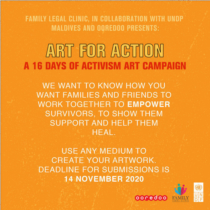 ބައިނަލްއަޤްވާމީ ގޮތުން ފާހަގަ ކުރާ "16 Days of Activism Against Gender Based Violence" ކެމްޕޭންގެ ޙަރަކާތެއްގެ ގޮތުން، "އާޓް ފޮރ އެކްޝަން" ގެ ނަމުގައި ކުރެހުމުގެ ކެމްޕޭނެއް ހުޅުވާލައިފިއެވެ.