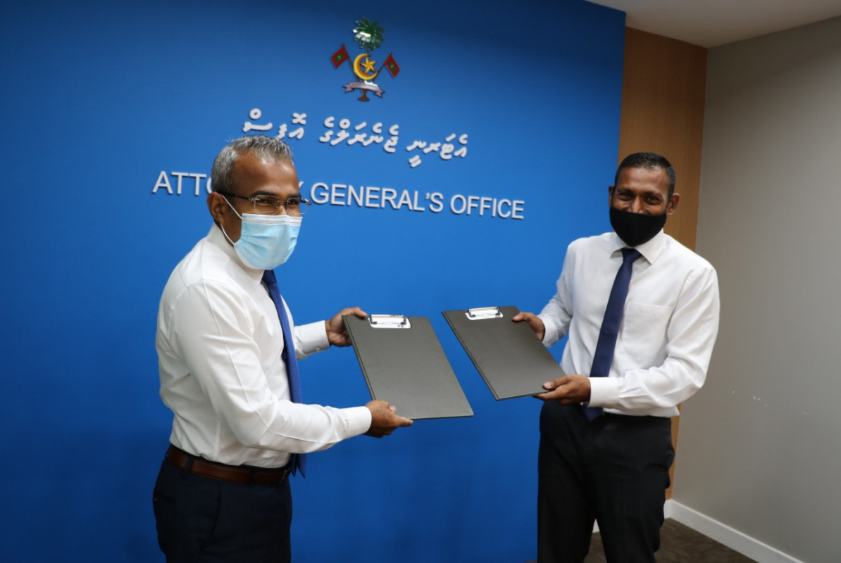 ދައުލަތުން ޤާނޫނީ ވަކީލެއްގެ އެހީތެރިކަން ފޯރުކޮށްދޭ ޖިނާއީ މައްސަލަތަކުގައި ލިޔެކިއުންތައް ލިބުމުގައި ވަކީލުންނަށް ދިމާވާ ދަތިތައް ހައްލު ކުރުމަށް އެޓަރނީ ޖެނެރަލް އިބްރާހިމް ރިފްއަތާއި ޕްރޮސިކިއުޓަރ ޖެނެރަލް ހުސައިން ޝަމީމް އެއްބަސްވުމެެއްގައި ސޮއި ކުރައްވައިފިއެވެ.