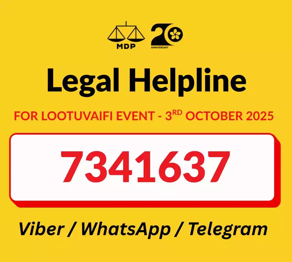 "ލޫޓުވައިފި ލޫޓުވައިފި" މުޒާހަރާ އާއި ގުޅިގެން ގާނޫނީ އެހީތެރިކަން ބޭނުންވާ ފަރާތްތަކަށް ގުޅޭނެ ނަމްބަރެއް އެމްޑީޕީން ހިއްސާކޮށްފި އެވެ.