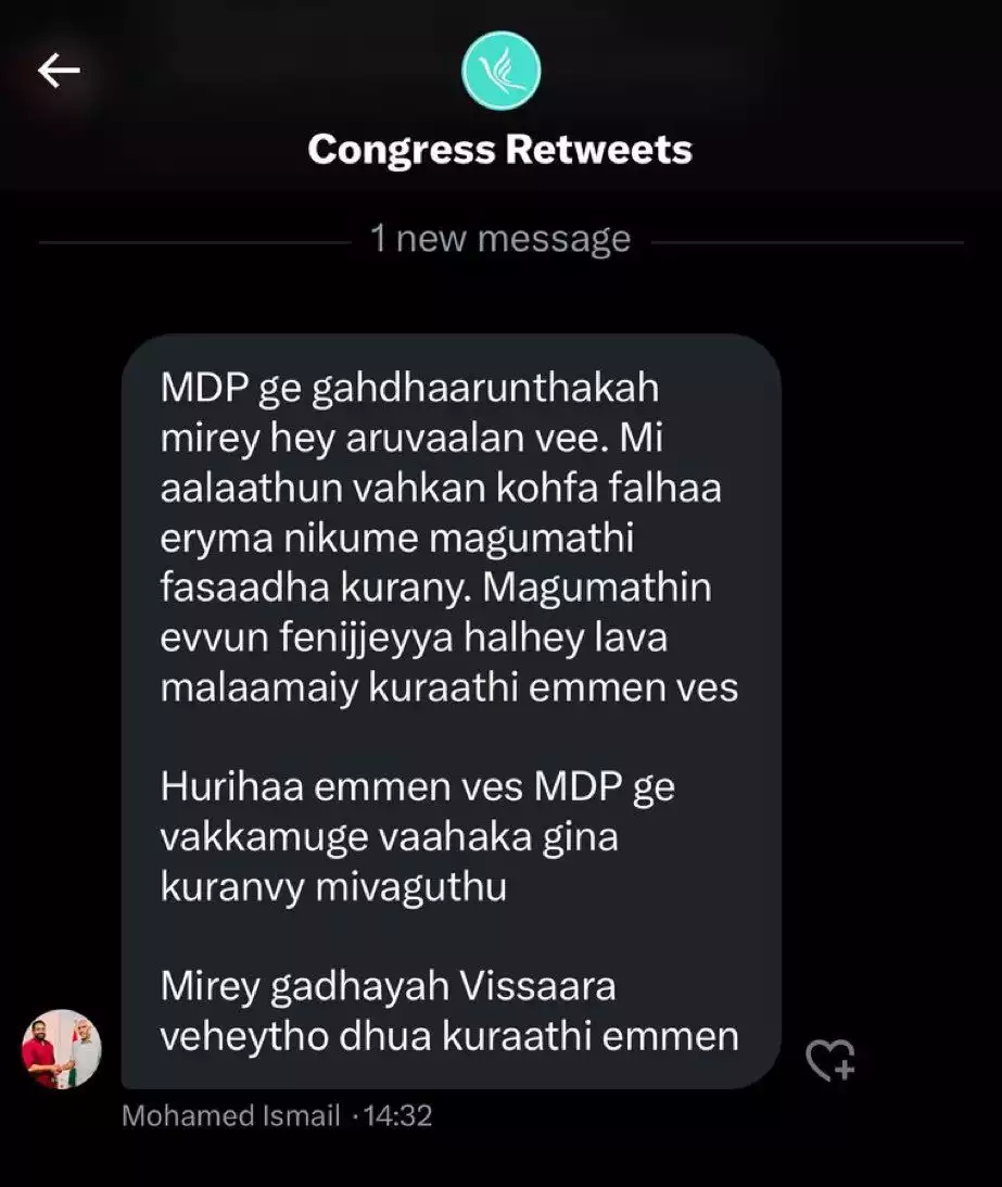 ކޮންގްރެސް ރީޓުވީޓްސް ކިޔާ ގުރޫޕެއްގައި މުހައްމަދު އިސްމާއިލް ކުރި މެސެޖެއްގައި ވިދާޅުވީ "އެމްޑީޕީގެ ގައްދާރުންތަކަށް މިރޭ ހޭ އަރުވާލަންވާނެ" މިހެންނެވެ.