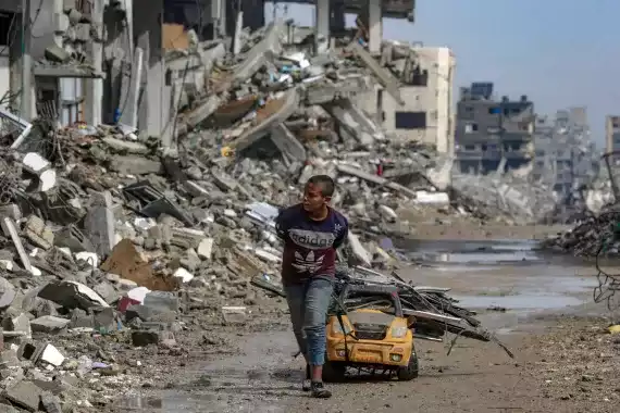 A Palestinian boy collects scrap metal from a street filled with debris in Sheikh Radwan neighborhood, northern Gaza City