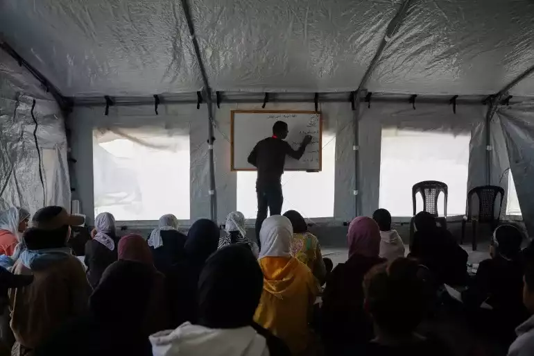 ޚާން ޔޫނިސްގެ ގޮނޑުދޮށުގައި ހަދާފައިވާ ޓެންޓެއްގެ ތެރޭގައި ފަލަސްތީނުގެ ދަރިވަރުންނަށް ކިޔަވައިދެނީ - ފޮޓޯ: އޭޕީ